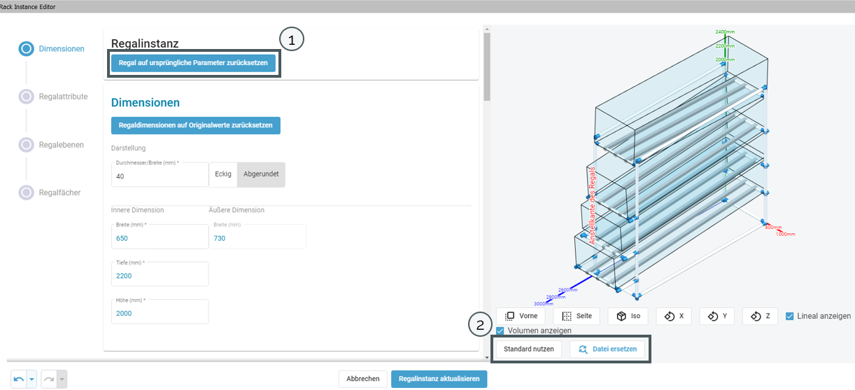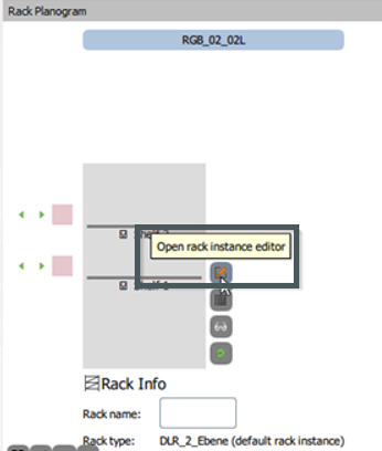 Der Rack Instance Editor erlaubt es Ihnen, Anpassungen an bereits im Planungsbereich hinzugefügten Regalen umzusetzen. Beachten Sie: Diese neuen Regalinstanzen sind spezifisch für den jeweiligen Planungsbereich, also werden sie nicht in die Common Data übernommen.