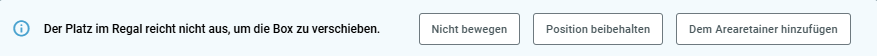 Insofern Platz im ausgewählten Regal ist, wird das Material auf einer passenden Regalebene angestellt. Falls nicht, erscheint ein Hinweis. Hier können Sie auswählen, ob Sie das Material nicht verschieben, die neue Position beibehalten oder das Material dem Area Retainer hinzufügen möchten: