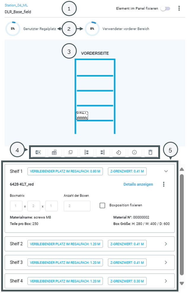 - In der Kopfzeile sind einige Grunddaten des Regals und Optionen für das Regal aufgelistet. Dazu gehören die zugeordnete Station (oben links in der Kopfzeile - blau hervorgehoben) und die Bezeichnung des Regals darunter.