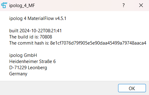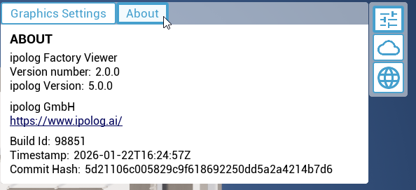 - Anschließend öffnet sich ein Fenster. In diesem ist unter "About" die Versions Nummer des Factory Viewers und die build id aufgeführt. Sowie die kompatiblen ipolog 4 Material Flow und Workspace Versionen.
