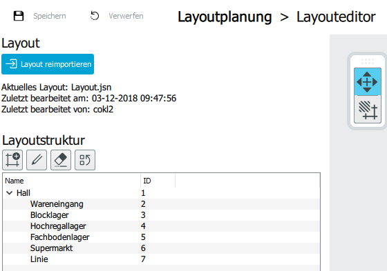 Ist kein Layoutlevel definiert, kann auch das Level Halle gewählt werden. Diesem sind standardmäßig alle Flächen zugewiesen. Auch die Flächen untergeordneter Levels zur Halle, können selektiert werden, wenn Halle als Layoutstruktur gewählt.