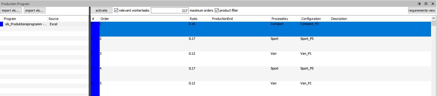 Das Produktionsprogramm muss von Ihnen erstellt und über "Scenario Admin > Import production porgram (xls)" in Workspace importiert werden.