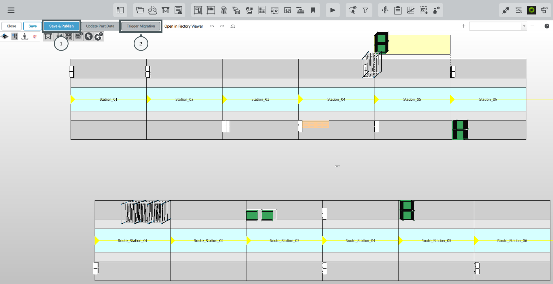 To transfer your existing placement planning - including all racks and boxes as well as the positions of the boxes in the racks - to ipolog web view, you must first save and publish the latest version of your planning space in ipolog Workspace. Selecting the “Trigger Migration” button will then synchronize the placement planning with ipolog web view.