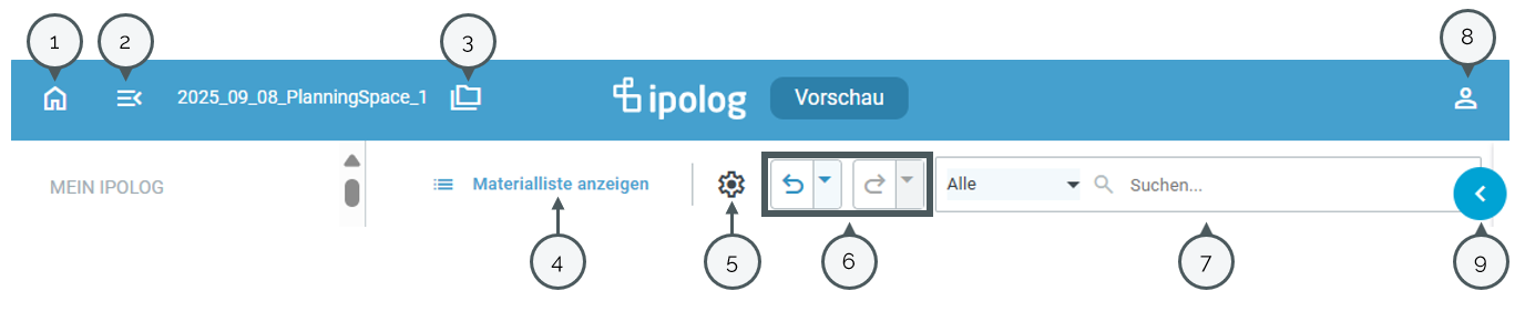 Here you can reset your user preferences, switch between German and English, switch to Project Structuring v2, and contact ipolog Support. You can also log out here.