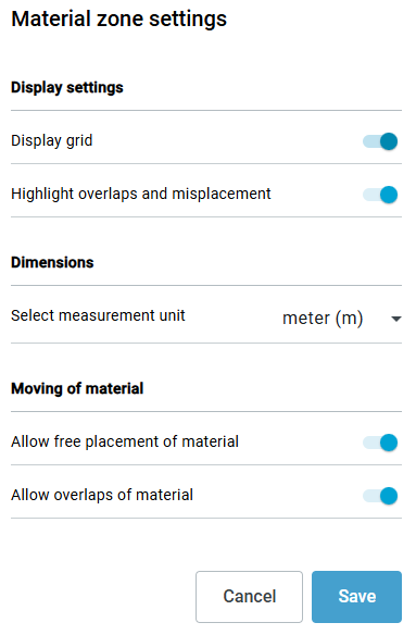 Enabling Allow free placement of material allows elements to be placed outside the boundaries of material areas. Enabling Allow overlaps of material, on the other hand, allows elements to be placed on top of each other in the 2D-view.