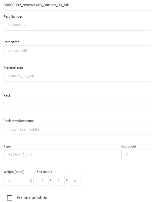 The information provided for this material includes the part number, the part name, the material area it is located in, the rack it is located in (in this case, none), the template name of the rack in which it is located, the box type in which it is located, the number of boxes in which it is stored, the empty weight of the box in which it is located, and the specified box matrix for the part.