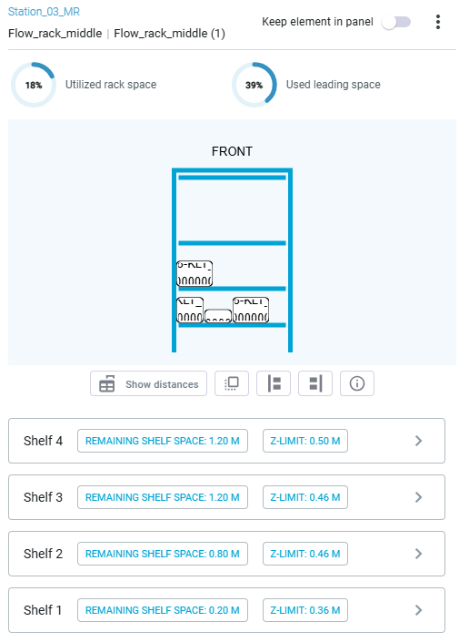This is followed by a 2D bird's-eye view of the material area. This view shows all the racks and parts placed on it. By clicking on individual elements, detailed information about the respective object can be displayed.