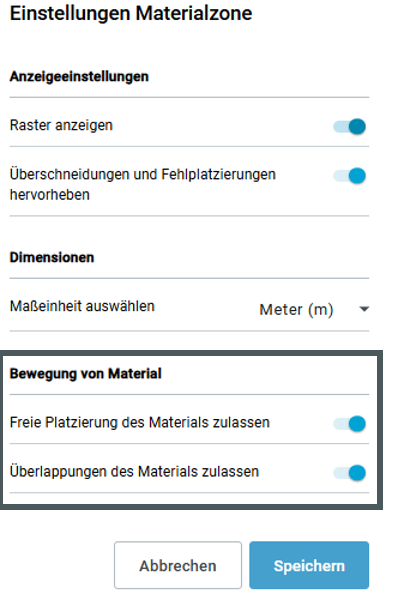 Here, under the sub-item “Movement of material,” you will find options for freely placing the material and allowing overlaps between materials: