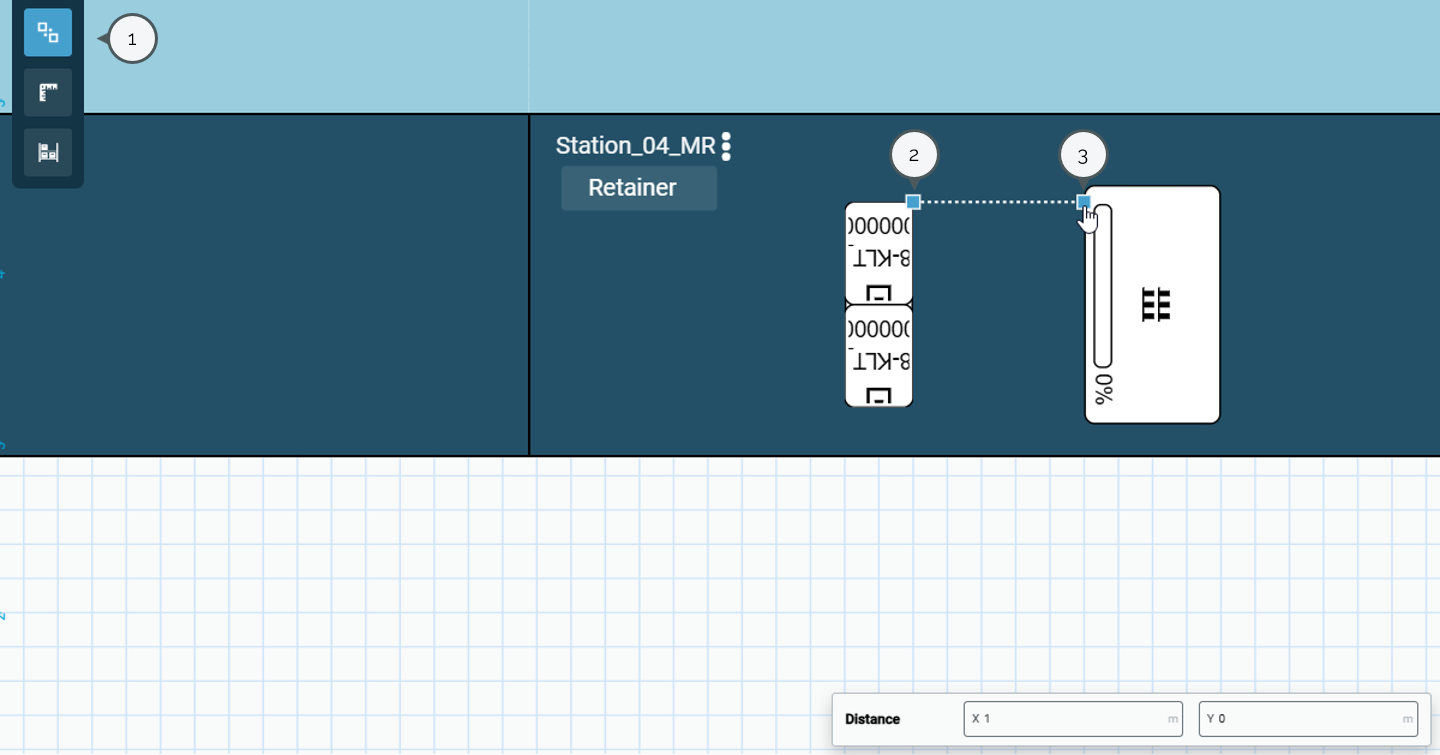 First select the option in the left menu bar [1] and then select the edge of the material or rack that you want to position at a distance [2]. Finally, select the point from which you want to distance the first selected element [3]:
