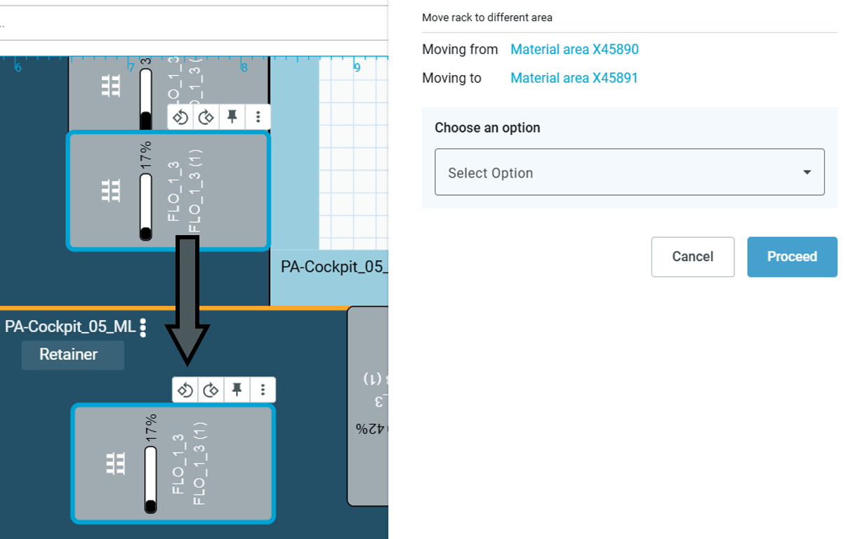 Use the “three dots” icon to select the option to move the material or rack to the Area Retainer.